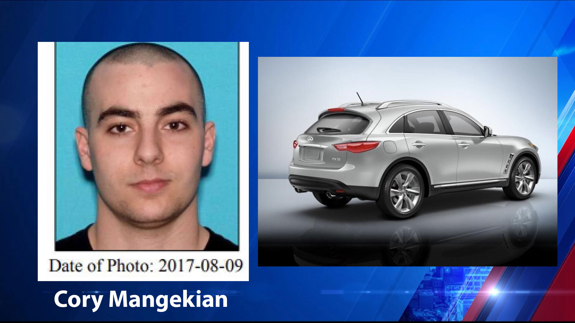 Investigators issued a public alert the next day about their search for Cory Mangekian and a stolen 2013 Infinity SUV that he was believed to be driving.